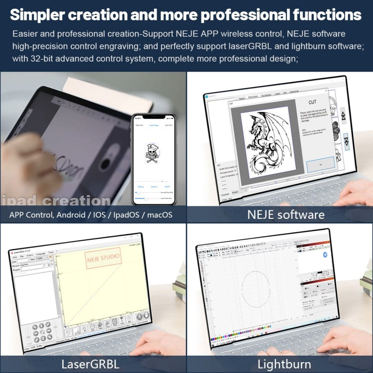1. Offline and APP wireless control. NEJE scanners transmit wirelessly. Cloud galleries and online Gcode make creation easier.